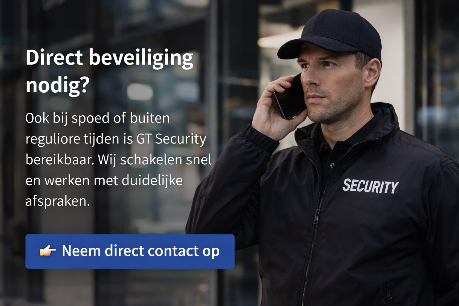 GT Security zorgt voor directe veiligheid door aanwezigheid. Onze beveiligers zijn zichtbaar, alert en volledig gefocust op hun omgeving. Door constante observatie en duidelijke procedures worden risico’s vroegtijdig herkend en beheerst.